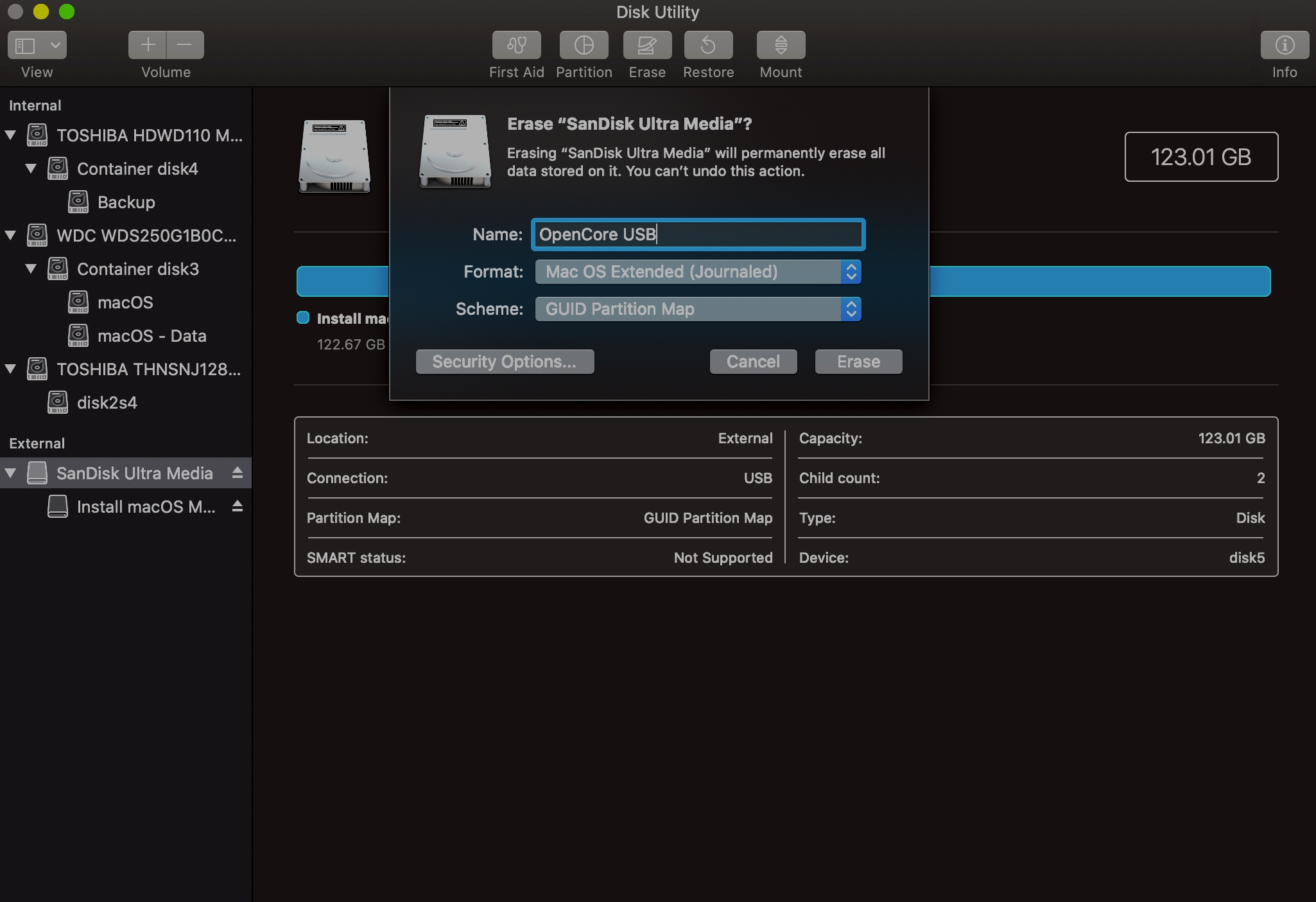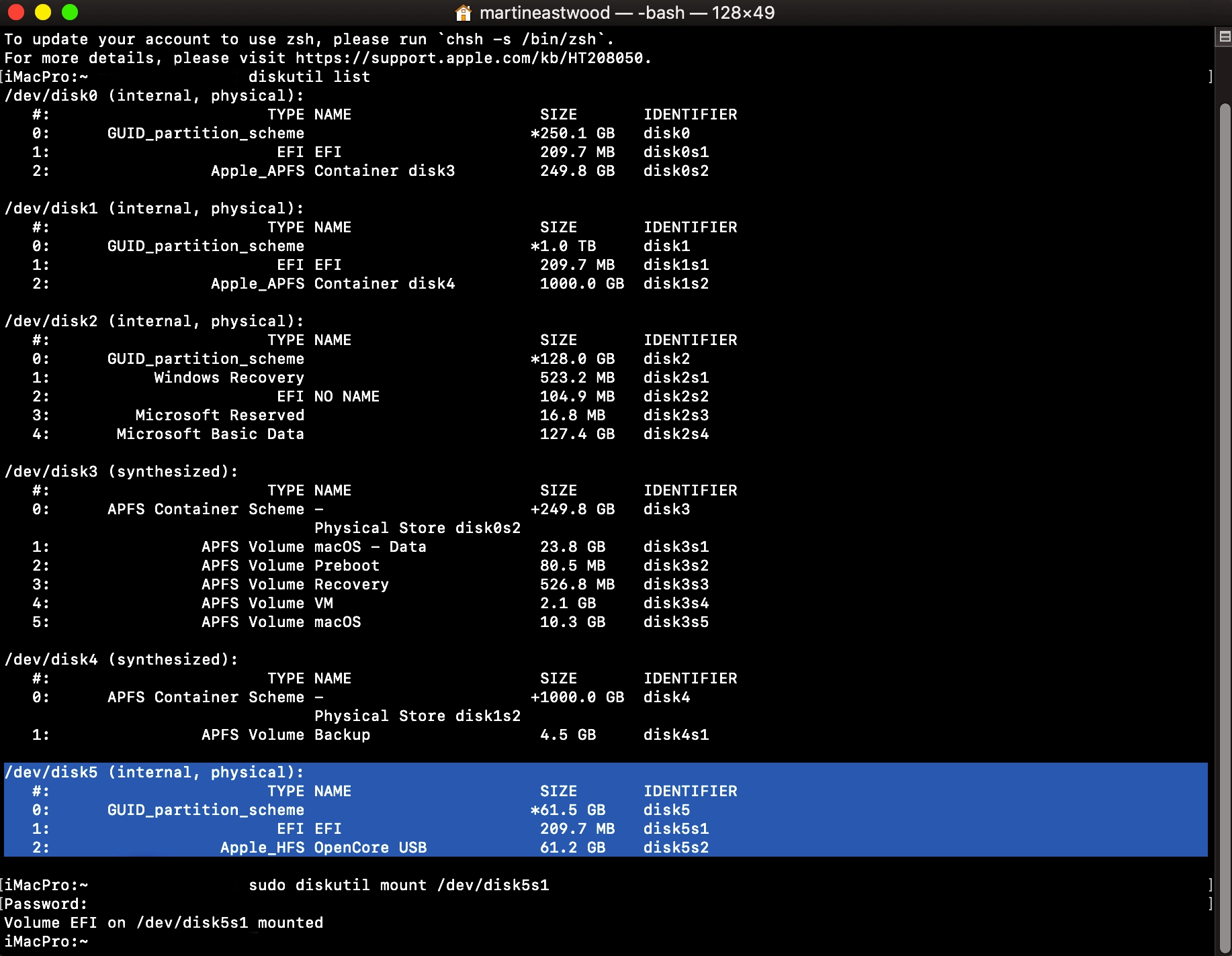 sudo Utilities/BootInstall/BootInstall.commandThis will give you a list of available disks, choose yours and you will be prompted to write a new MBR. Choose yes[y] and you'll be finished. This will provide you with an EFI partition with a boot file, this is where we'll add our OpenCore EFI.