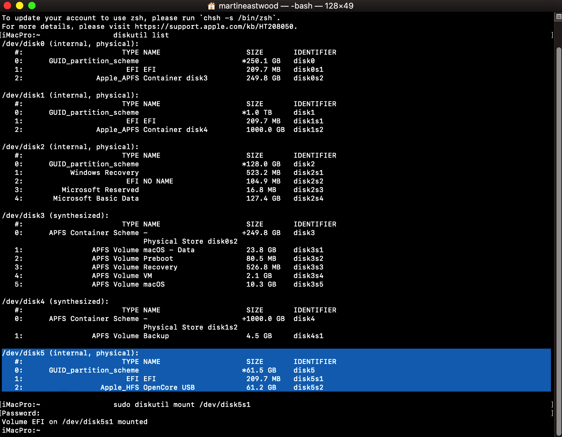This will give you a list of available disks, choose yours and you will be prompted to write a new MBR. Choose yes[y] and you'll be finished. This will provide you with an EFI partition with a boot file, this is where we'll add our OpenCore EFI.